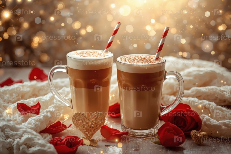 Концепт кафе или кафе в честь Дня святого Валентина. Вкусный многослойный кофе в прозрачном стакане, сердца и лепестки роз крупным планом