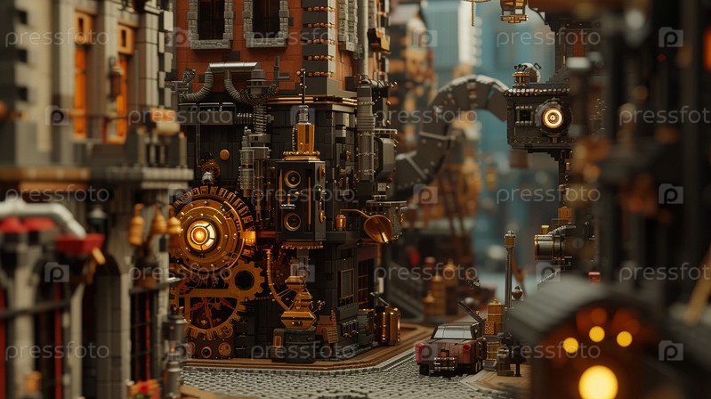 Улицы города Steampunk с механизмами и часами