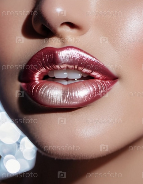 Сустав женских губ с мерцающей жемчужной помадой. Прикосновение искры. Губы слегка расставлены, открывая блеск белых зубов. Чувственность и сексуальность. Мать жемчужной помады. ИИ