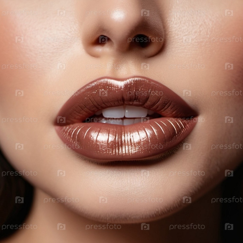 Замкнутые губы женщины или молодой девушки с мерцающей коричневой, бордовой или бордовой помадой. Губы слегка расставлены, открывая мельком белые зубы. Сексуальность чувственности. генерируемый