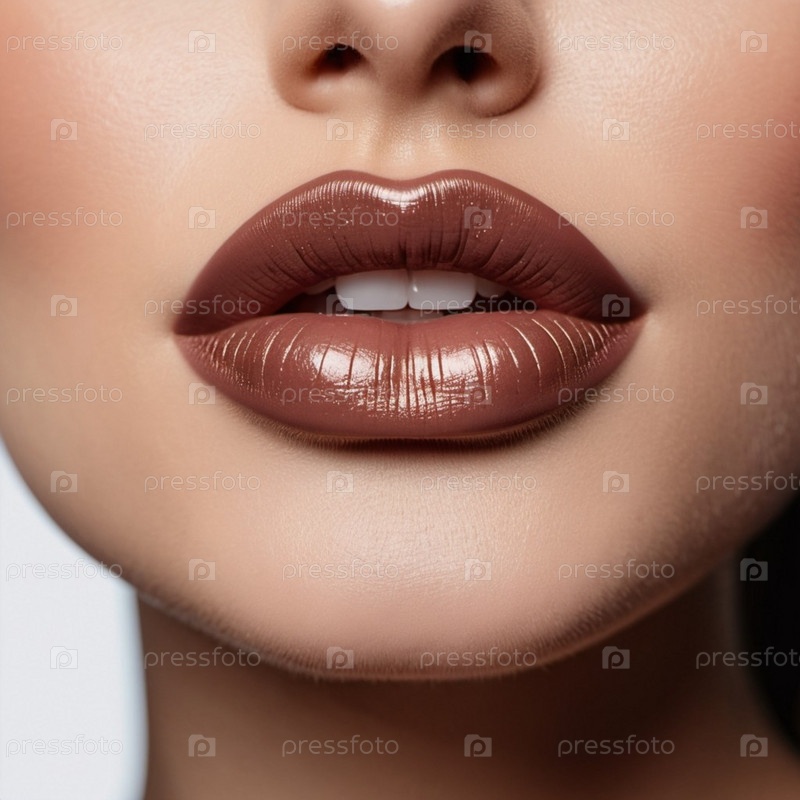 Замкнутые губы женщины или молодой девушки с мерцающей коричневой, бордовой или бордовой помадой. Губы слегка расставлены, открывая мельком белые зубы. Сексуальность чувственности. генерируемый