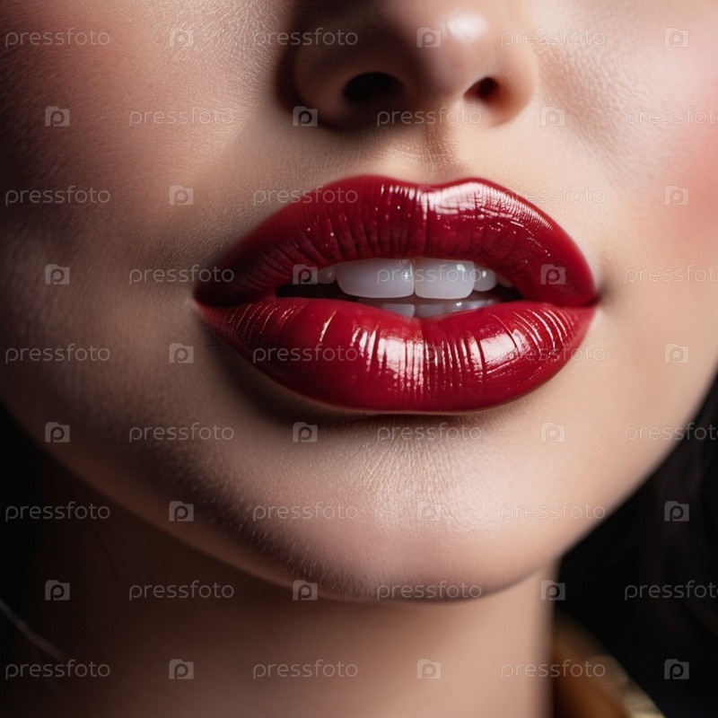 Крупный план губ женщины, с мерцающей красной помадой, которая добавляет блеск. Губы слегка расставлены, открывая мельком белые зубы. Чувственность и сексуальность. генерируемый