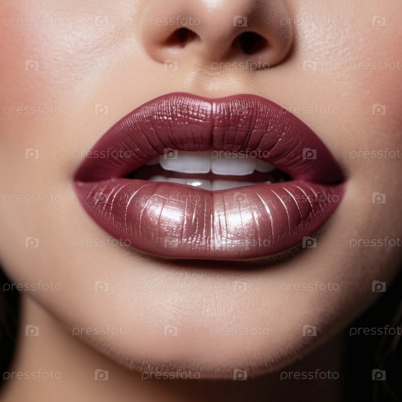 Замкнутые губы женщины или молодой девушки с мерцающей коричневой, бордовой или бордовой помадой. Губы слегка расставлены, открывая мельком белые зубы. Сексуальность чувственности. генерируемый