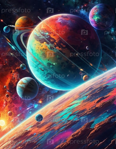 Планетарная система с несколькими планетами, большой ярко окрашенный газовый гигант и скалистая планета. Яркие звезды и обширное пространство темного пространства с галактикой на заднем плане. Космические пространства. Космонавтика. ИИ