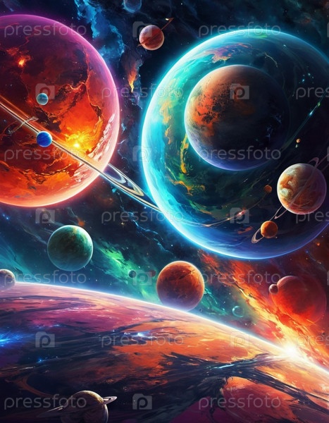 Планетарная система с несколькими планетами, большой ярко окрашенный газовый гигант и скалистая планета. Яркие звезды и обширное пространство темного пространства с галактикой на заднем плане. Космические пространства. Космонавтика. ИИ