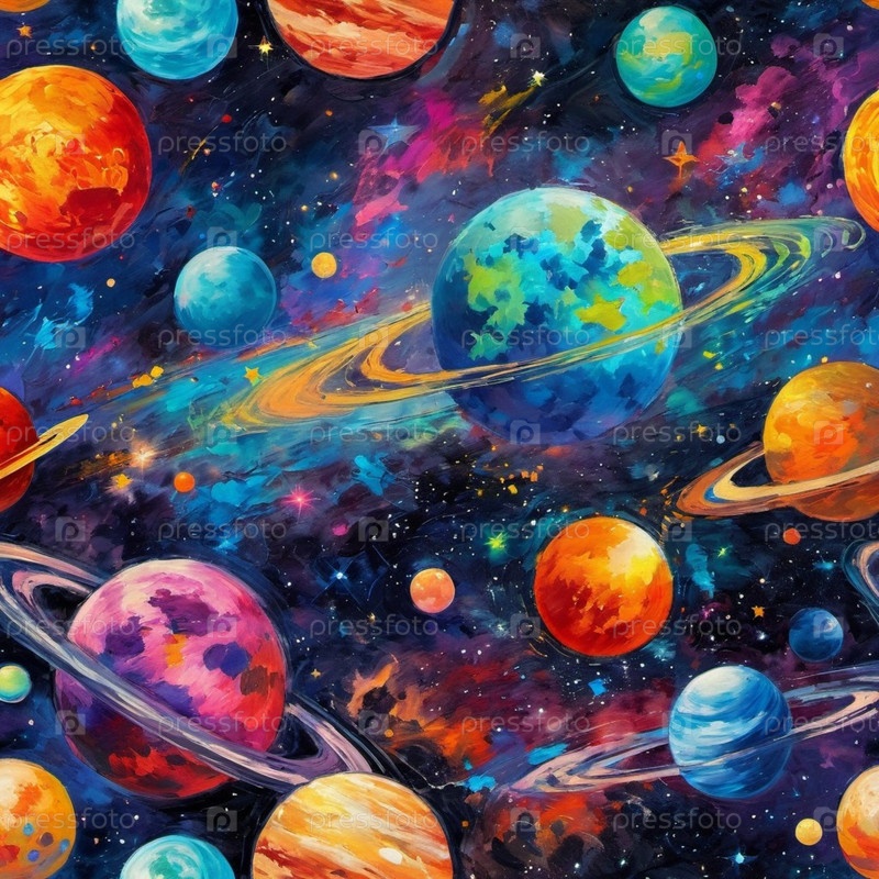 Планетарная система с несколькими планетами, большой ярко окрашенный газовый гигант и скалистая планета. Яркие звезды и обширное пространство темного пространства с галактикой на заднем плане. Космические пространства. Космонавтика. ИИ
