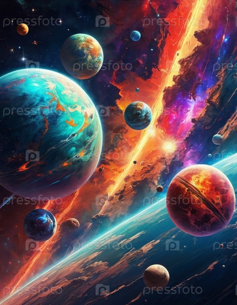 Планетарная система с несколькими планетами, большой ярко окрашенный газовый гигант и скалистая планета. Яркие звезды и обширное пространство темного пространства с галактикой на заднем плане. Космические пространства. Космонавтика. ИИ