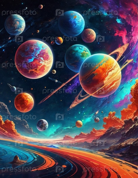 Планетарная система с несколькими планетами, большой ярко окрашенный газовый гигант и скалистая планета. Яркие звезды и обширное пространство темного пространства с галактикой на заднем плане. Космические пространства. Космонавтика. ИИ