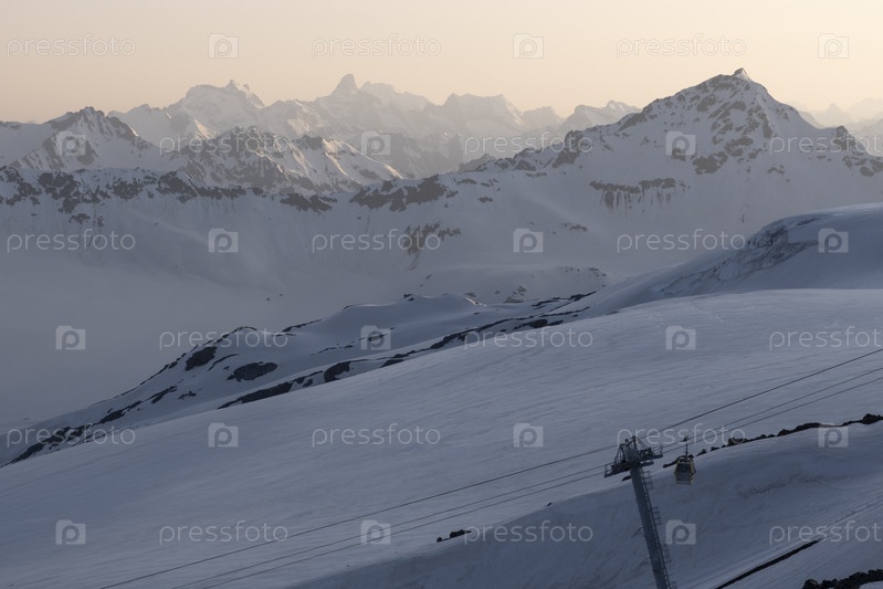 Закат на горе Эльбрус, вид на горы и канатная дорога