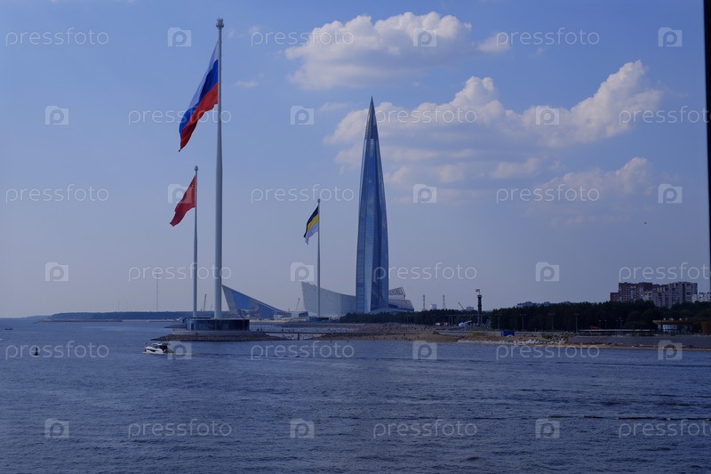 Вид на набережную, Лахта центр, Мачты с флагами России_Советского Союза и флаг Российской Империи который использовался с 1858 по 1896 гг. Россия Санкт-Петербург Июль 30 2025 г
