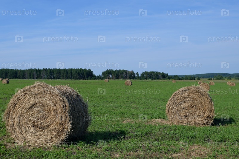 Рулоны сена на полях — это большие, плотно скрученные цилиндры из сушеной травы, которые получаются после скашивания и прессования сена механическим способом с помощью пресс-подборщика, служат для заготовки корма скоту на зиму Россия Мордовия Июль 22 2025