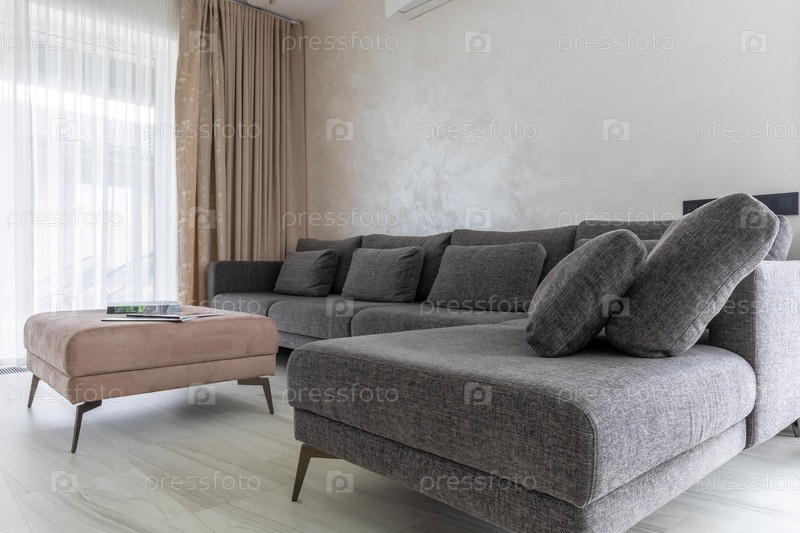 Замок современной гостиной с гостиной с удобным секционным диваном из серой ткани и коричневым замшевым оттоманом, расположенным рядом с большими окнами с нейтральными шторами в ярком, минималистичном дизайне интерьера