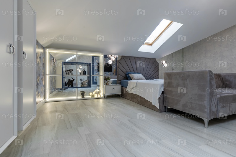 Широкий вид на интерьер современной главной спальни в мансардном пространстве, с большой кроватью с развевающимся изголовьем, плюшевым серым диваном, интегрированным зеркальным хранилищем и элегантными цветочными обоями