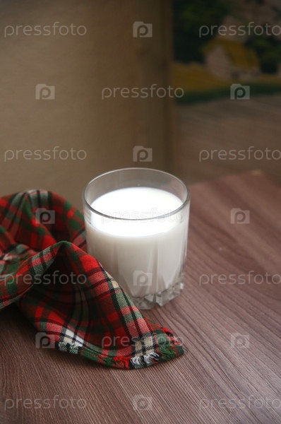 Полезные напитки. Стакан коровьего вкусного молока на столе. Полезное питание и напитки
