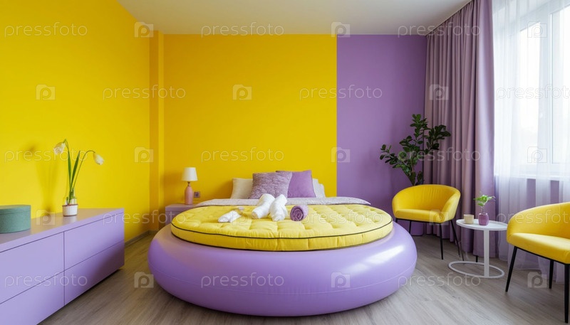 Современная спальня с круглой кроватью сиреневой и желтой. Сгенерированный ИИ