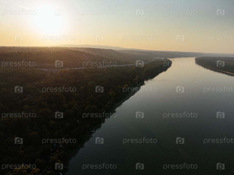 Вид с воздуха на безмятежный речной остров на закате, окруженный пышным лесом. г