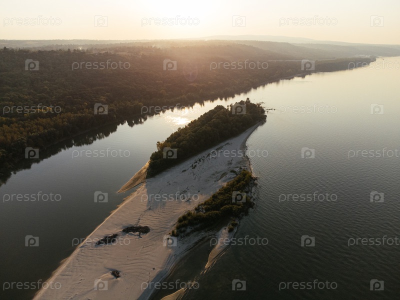 Вид с воздуха на безмятежный речной остров на закате, окруженный пышным лесом. г