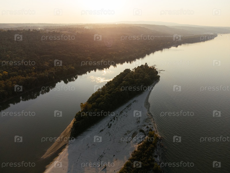 Вид с воздуха на безмятежный речной остров на закате, окруженный пышным лесом. г