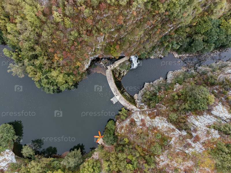 Вид с воздуха на плотину и водохранилище, окруженные зелеными лесными холмами в Сербии недалеко от Узице. г