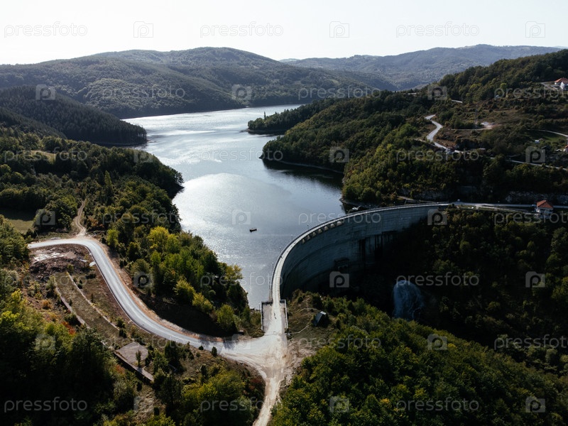 Вид с воздуха на плотину и водохранилище, окруженные зелеными лесными холмами в Сербии недалеко от Узице. г