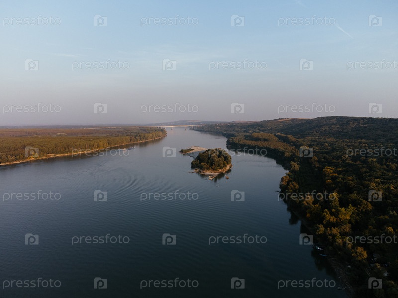 Вид с воздуха на безмятежный речной остров на закате, окруженный пышным лесом. г