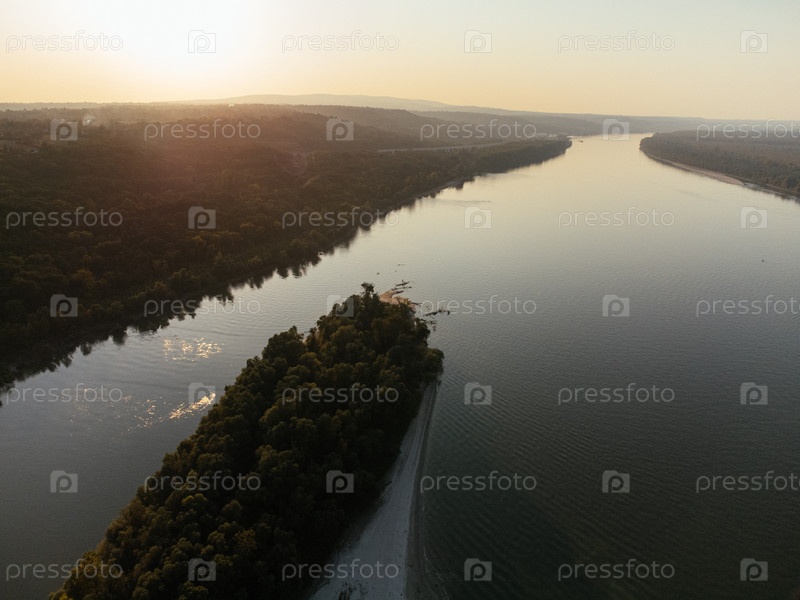 Вид с воздуха на безмятежный речной остров на закате, окруженный пышным лесом. г