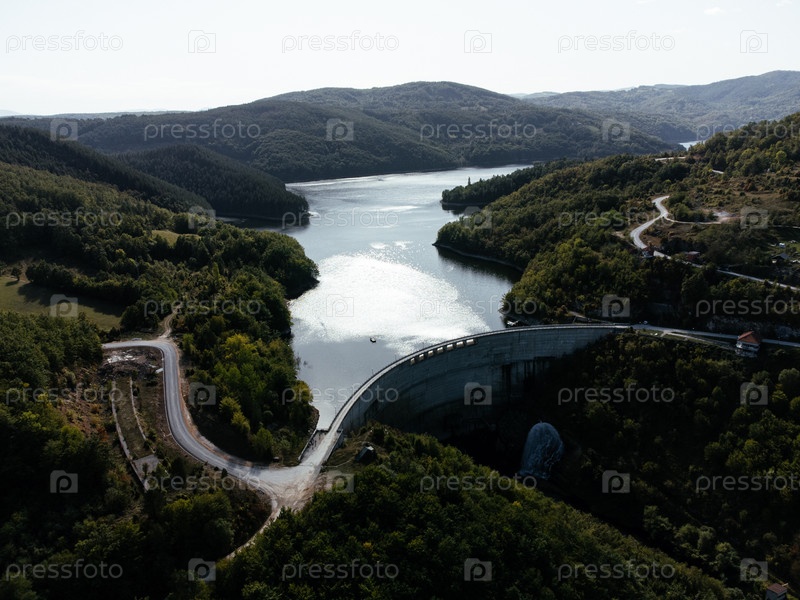 Вид с воздуха на плотину и водохранилище, окруженные зелеными лесными холмами в Сербии недалеко от Узице. г