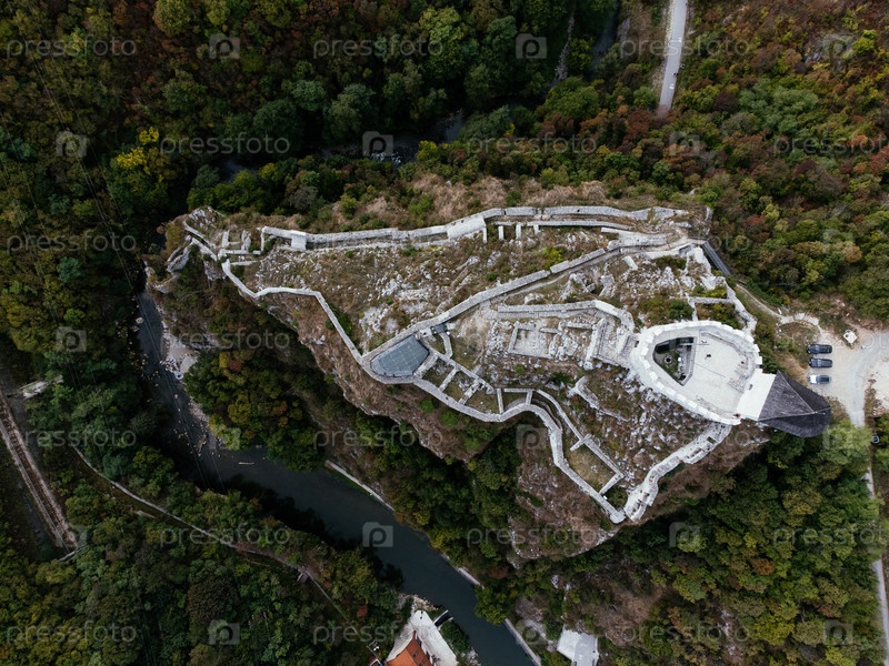 Средневековая крепость на вершине скалы с видом на реку и город с красной крышей в Узице, Сербия, с извилистой дорогой. г