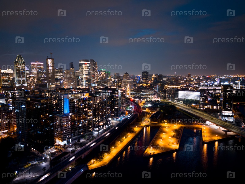 Монреальский горизонт освещается в сумерках и отражается в воде, Квебек, Канада