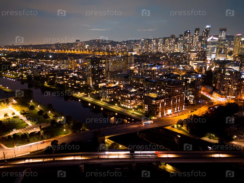 Монреальский горизонт освещается в сумерках и отражается в воде, Квебек, Канада
