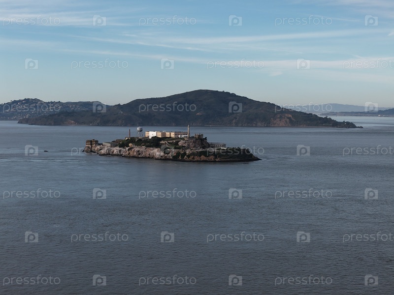 7 сентября 2025 года полет вертолета над тюрьмой и маяком острова Алькатрас в заливе Сан-Франциско, Калифорния, вид на вертолет. г