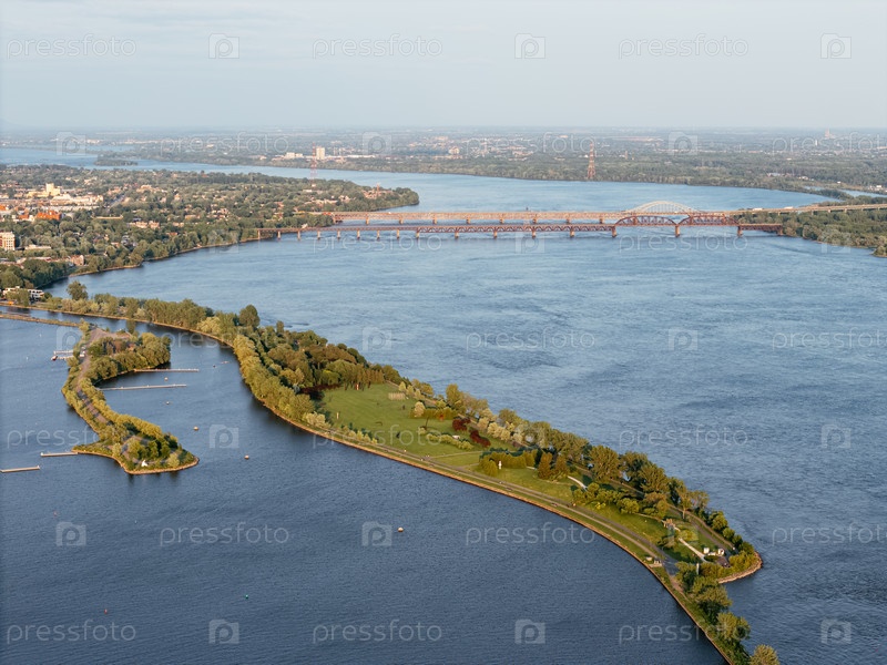 Вид с воздуха на полуостров маяка Rene-Levesque Park в Лачине, Монреаль вдоль реки Святого Лаврентия на закате. г