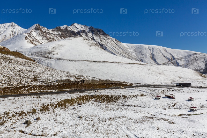 Военное шоссе Грузии через Крестовый перевал в Грузии, исторический и единственный сухопутный маршрут, соединяющий Россию и Грузию через Главный Кавказский хребет. Горный снежный пейзаж в солнечный день