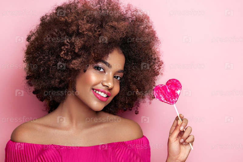 Красивый портрет африканской девушки с леденцом в форме сердца