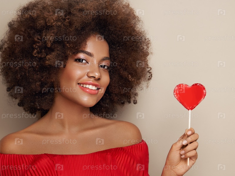 Красивый портрет африканской девушки с леденцом в форме сердца