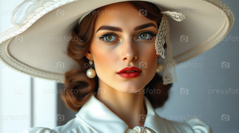 Минимализм. Студийный портрет стильной, элегантной женщины в ретро платье и большой шляпе с луком. Мода 1950-х годов. В прошлом веке
