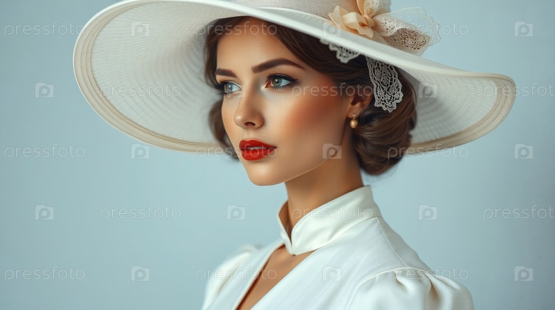 Минимализм. Студийный портрет стильной, элегантной женщины в ретро платье и большой шляпе с луком. Мода 1950-х годов. В прошлом веке
