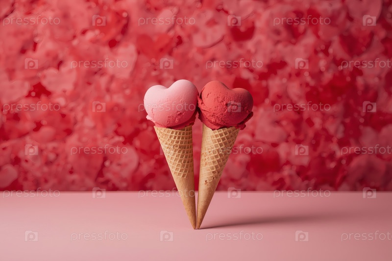 Сладкий десерт. Любовь к мороженому. Минимализм. Два вафельных шишка в форме сердца на красном фоне. Концепция Дня святого Валентина. Баннер, реклама