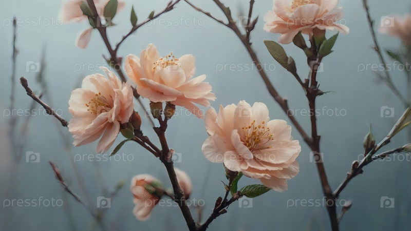 Цветочный фон с красивым эффектом боке. Рядом с цветущим деревом. Цветущий абрикос весной на серо-голубом фоне