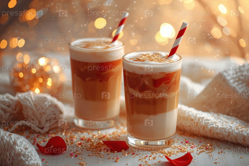 Концепт кафе или кафе в честь Дня святого Валентина. Вкусный многослойный кофе в прозрачном стакане, сердца и лепестки роз крупным планом