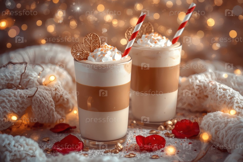 Концепт кафе или кафе в честь Дня святого Валентина. Вкусный многослойный кофе в прозрачном стакане, сердца и лепестки роз крупным планом