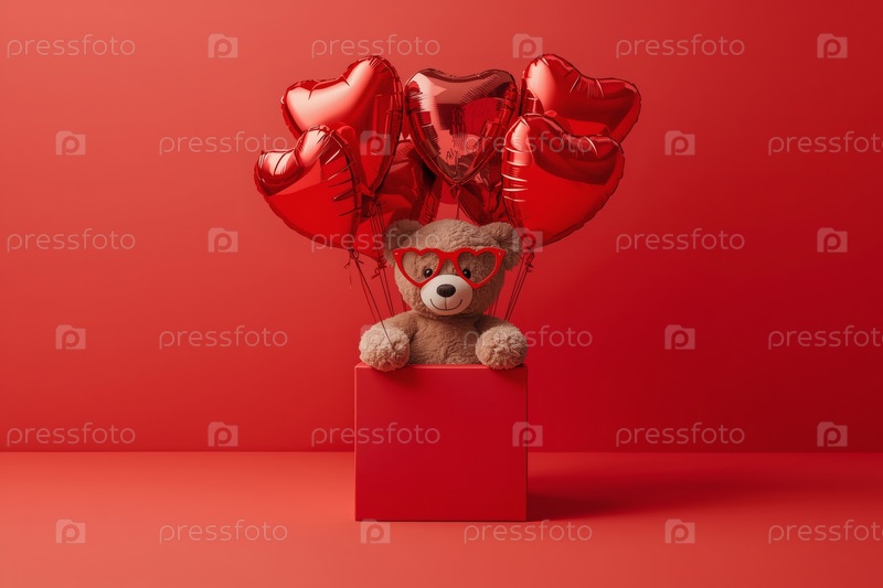 Концепция Дня святого Валентина. Минимализм. Подарок с плюшевым медведем и воздушными шарами на красном студийном фоне