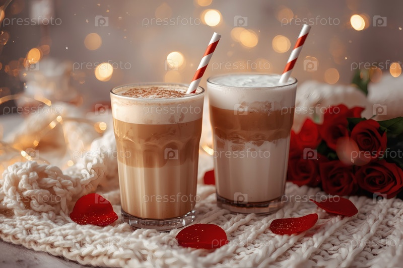 Концепт кафе или кафе в честь Дня святого Валентина. Вкусный многослойный кофе в прозрачном стакане, сердца и лепестки роз крупным планом