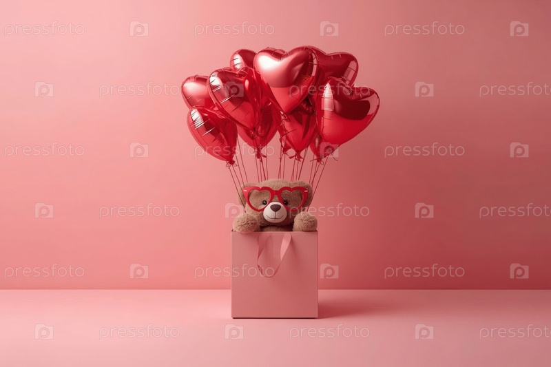 Концепция Дня святого Валентина. Минимализм. Подарок с плюшевым медведем и воздушными шарами на красном студийном фоне
