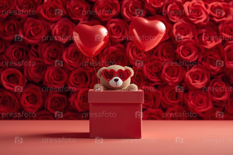 Концепция Дня святого Валентина. Минимализм. Подарок с плюшевым медведем и воздушными шарами на красном студийном фоне