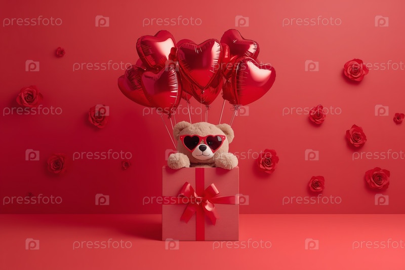 Концепция Дня святого Валентина. Минимализм. Подарок с плюшевым медведем и воздушными шарами на красном студийном фоне