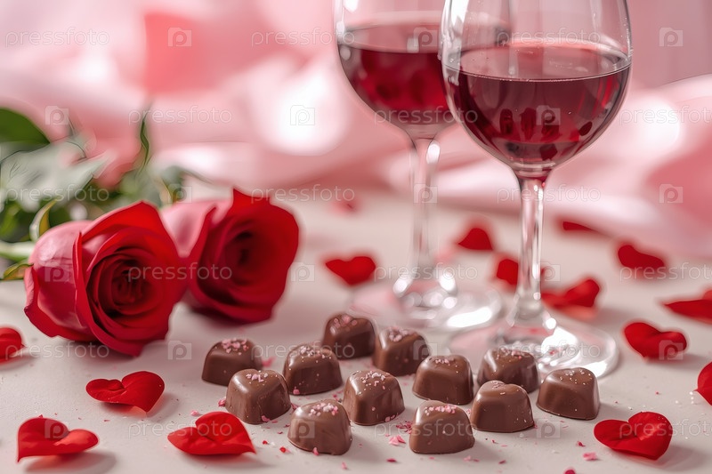 Концепция Дня святого Валентина. Два бокала красного вина и шоколадные конфеты в окружении роз и сердец в День святого Валентина