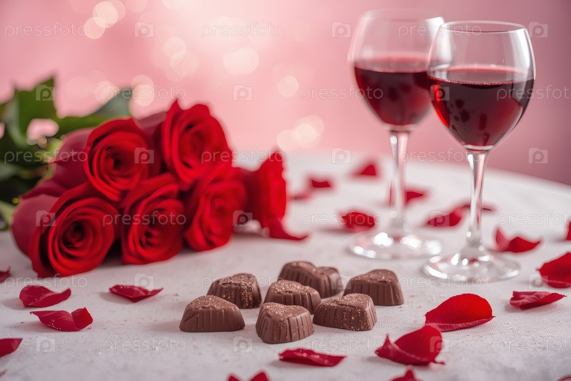 Концепция Дня святого Валентина. Два бокала красного вина и шоколадные конфеты в окружении роз и сердец в День святого Валентина
