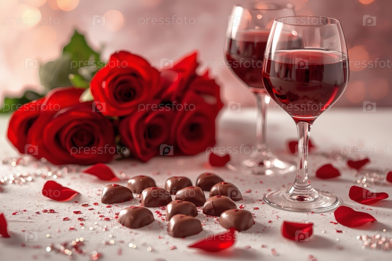 Концепция Дня святого Валентина. Два бокала красного вина и шоколадные конфеты в окружении роз и сердец в День святого Валентина