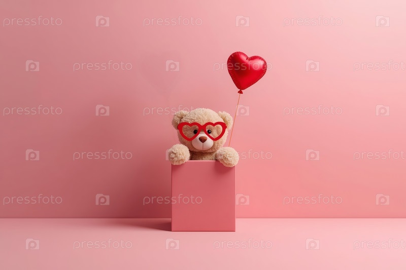 Концепция Дня святого Валентина. Минимализм. Подарок с плюшевым медведем и воздушными шарами на красном студийном фоне